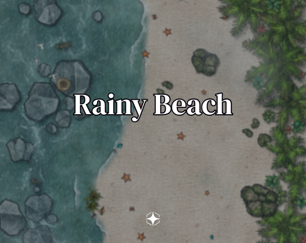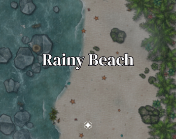 Upgrade your next TTRPG session with a battle map of a rainy beach. What enemies make the rocky shores their home? How does the rain affect the battlefield? What surprises are in the water? It is up to you!